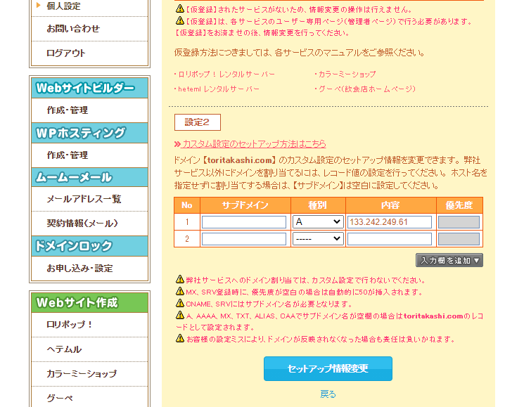 ここで最初に確認した、レンタルサーバのIPアドレスを使います。