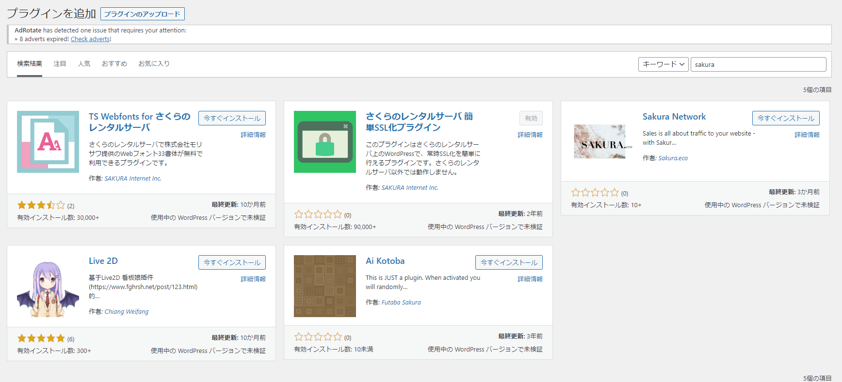 そして検索ボックスに「sakura」と入力し、「さくらのレンタルサーバ 簡単SSL化プラグイン」をインストールします。