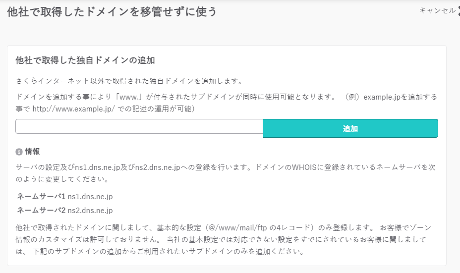 「他社で取得したドメインを移管せずに使う」をクリックします。