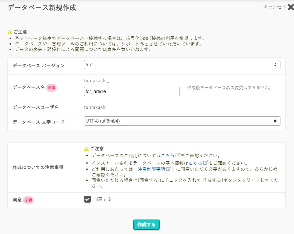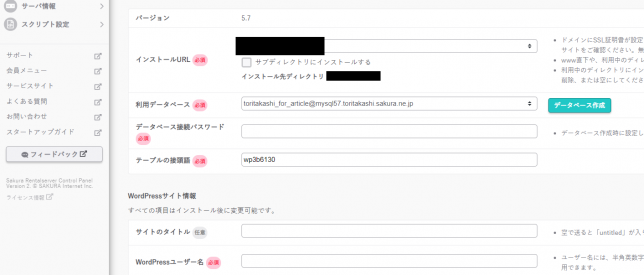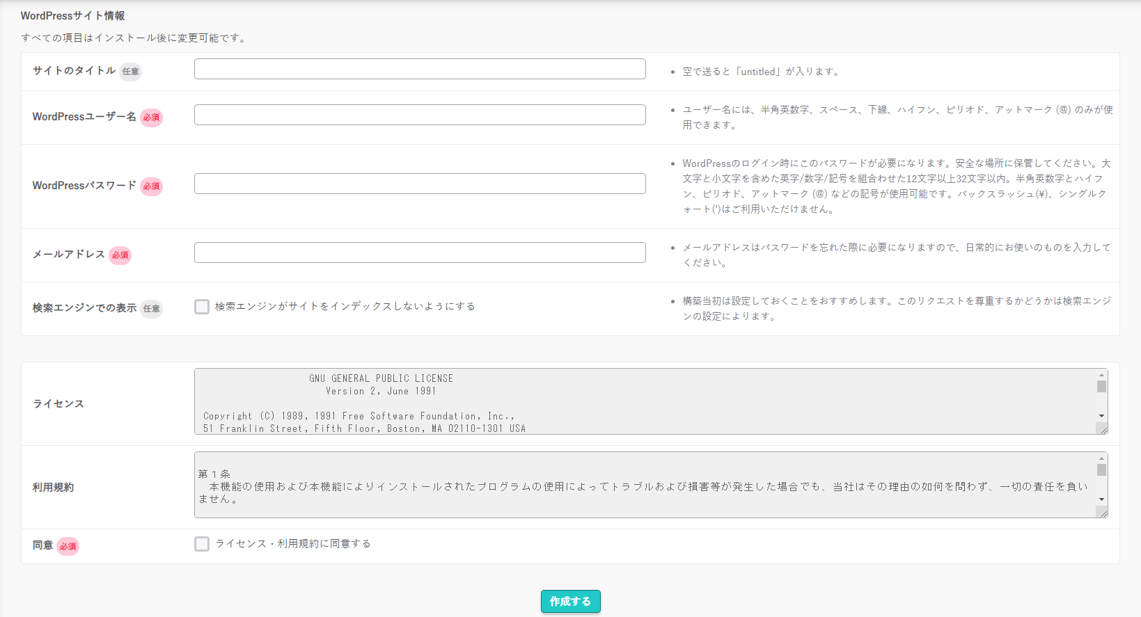 これで作成するボタンを押すと、レンタルサーバ上にWordPress環境が構築できます。