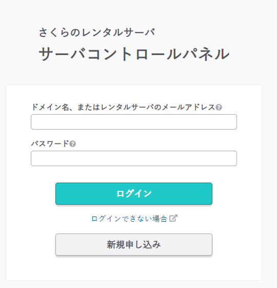 レンタルサーバの購入手続きが完了すると、コントロールパネルのログイン情報が送られてくるので、それらの情報をコチラのログインページに入力します。