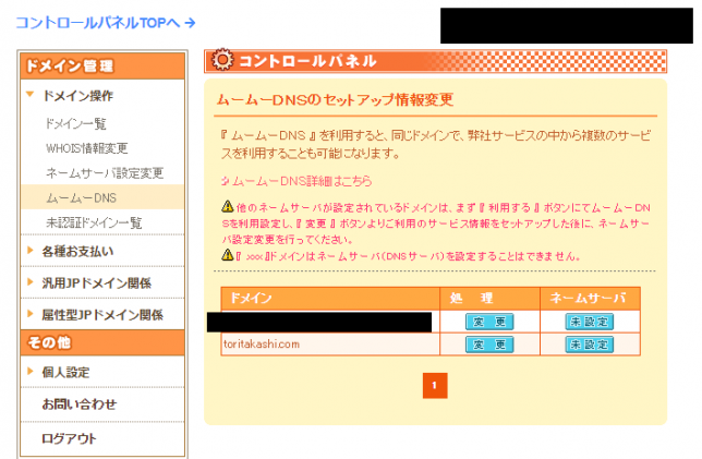 まずムームーDNSをクリックし、購入したドメインの処理の「変更」をクリックします。