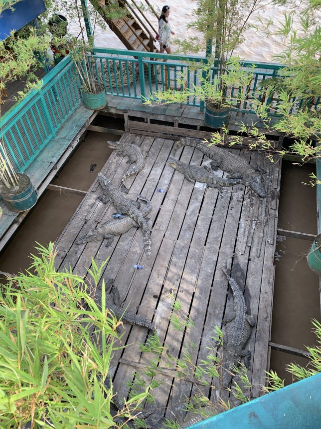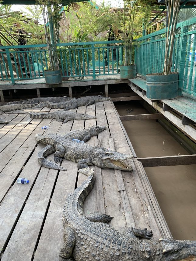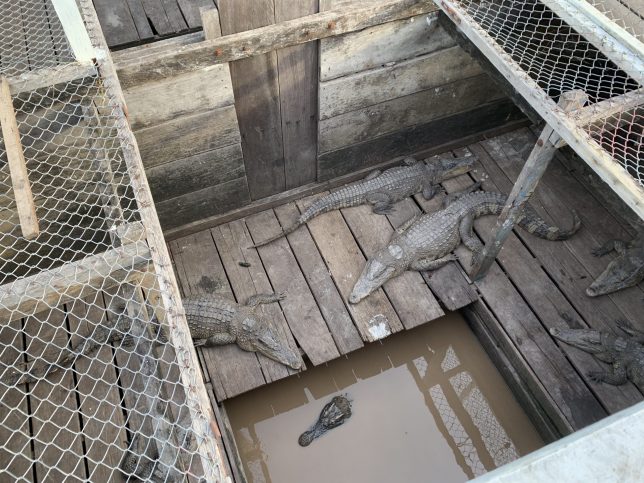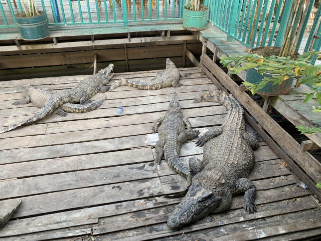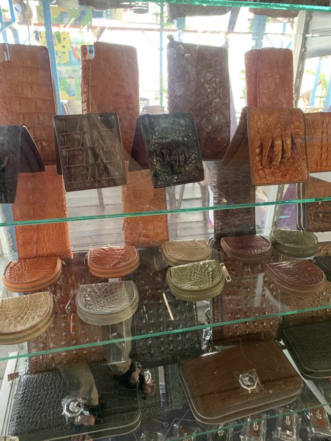 全ての建物でワニが飼われており、ワニ革の財布やバッグが土産物として販売されていた。