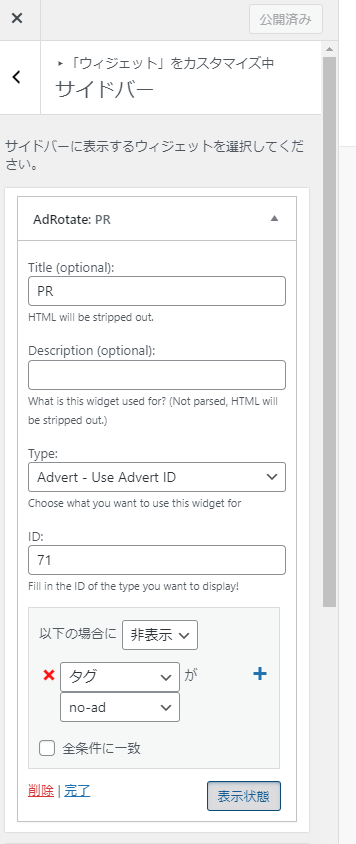 ②カスタマイズのウィジェットの表示設定で、タグに「no-ad」がある時は非表示にする