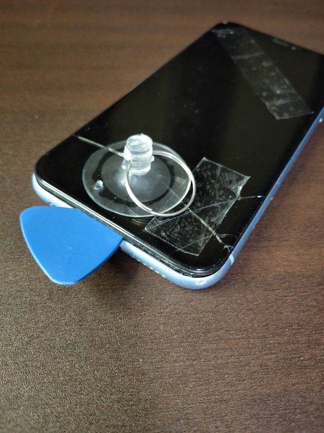 吸盤をiPhone下端につけ、スクリーンを引っ張り、ピックを差し込む