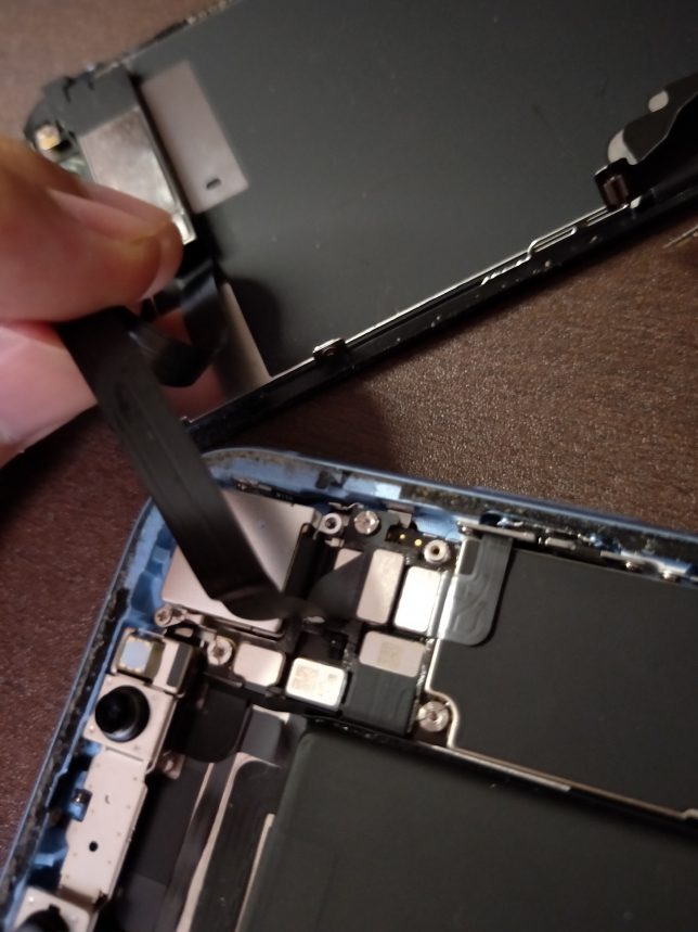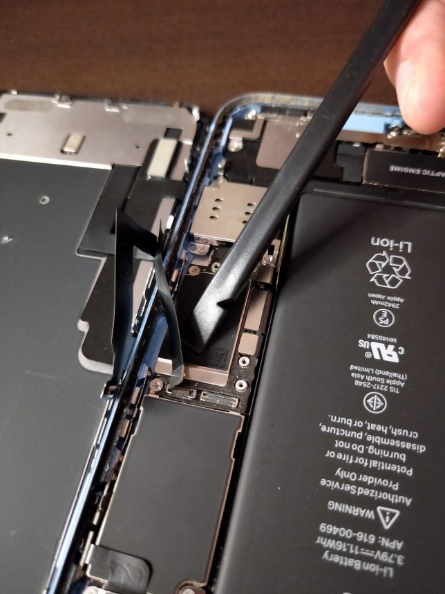 先ほどデジタイザやディスプレイケーブルを外したときと同様、スパッジャーや爪で持ち上げて外します。