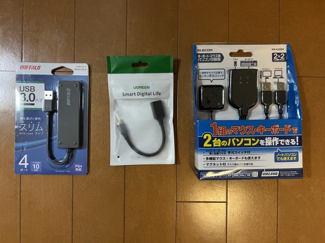 KMスイッチ(一番右)の入力ポートが2つしかないものが大半だったので、②USBポート(一番左)を購入しました。