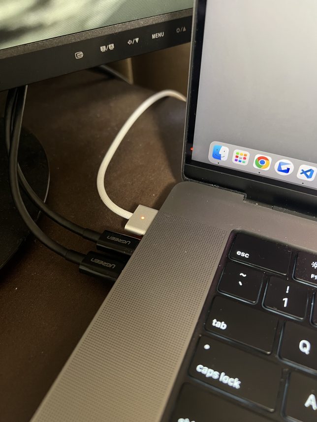 クラムシェルモードをONにするための条件は「電源に接続されていること」なので、電源をつなぎます。
