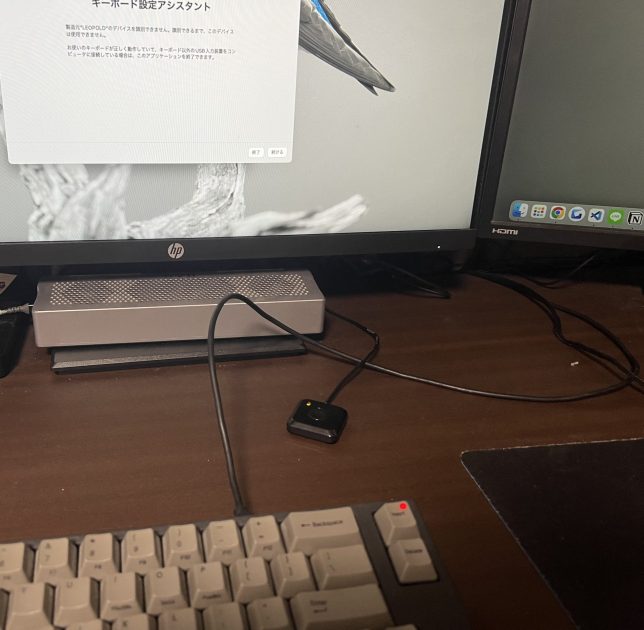 ちょっと遠いですが右のモニターを見ると、キーボードが認識され初期設定ウィザードが出てきています!