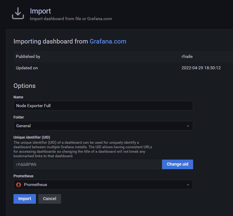Loadボタンをクリックするとこの画面に遷移するので、Prometheusのところから先ほど追加したデータソースを選択して、Importをクリックします。