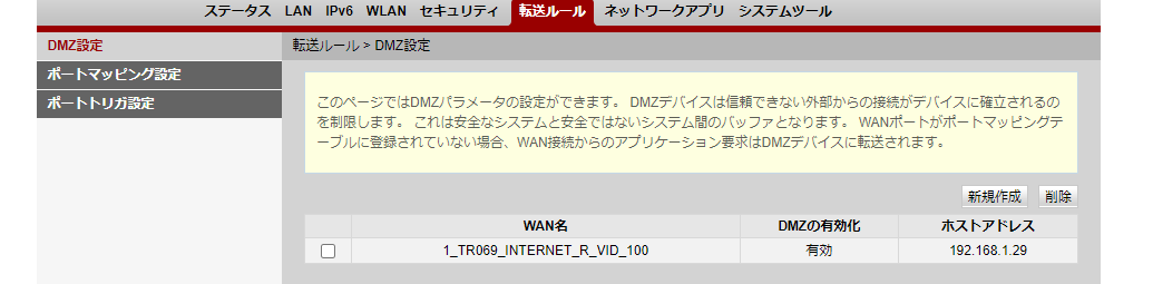 自宅サーバのIPが192.168.1.29だったので、こいつをDMZに指定してやります。