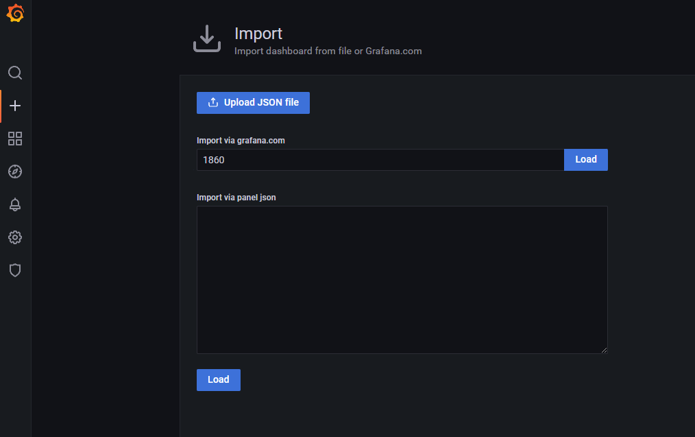 そしてGrafanaのダッシュボードに戻り、左側メニューの+のimportを選択して、Import via grafana.comにペーストします。