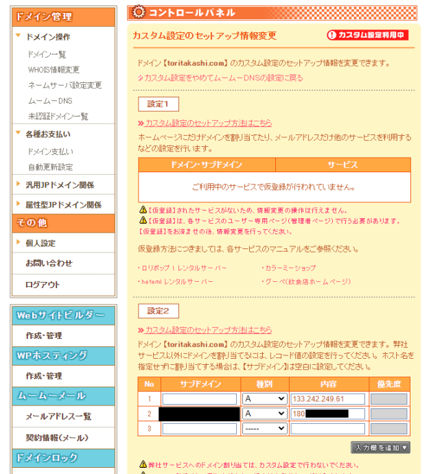 自分の家のIPアドレスは確認くんで確認しておいたので、とりたいサブドメインと自分の家のIPアドレスをここに設定します。