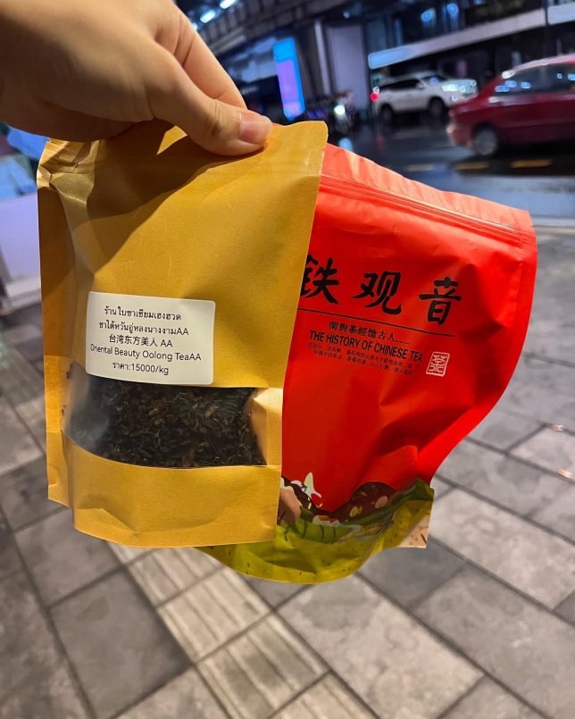 左が友人が激推ししていた東方美人茶の特級で100g1500バーツ(5730円程度)