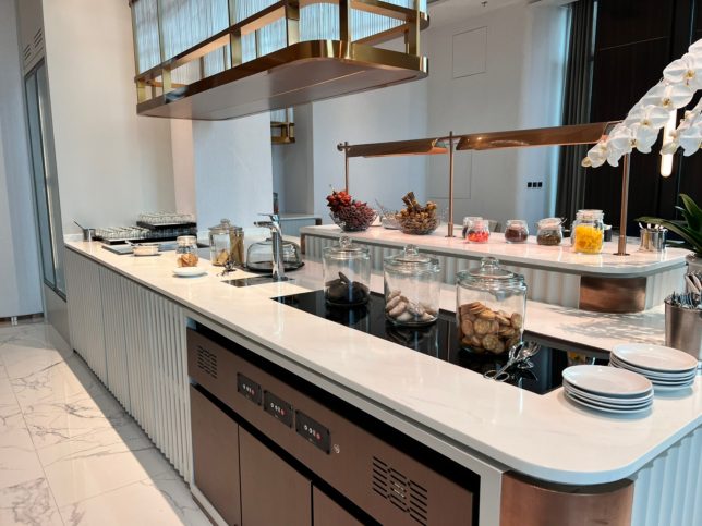 フルーツやビスケットを自分で取りに行くセルフサービススタイル。