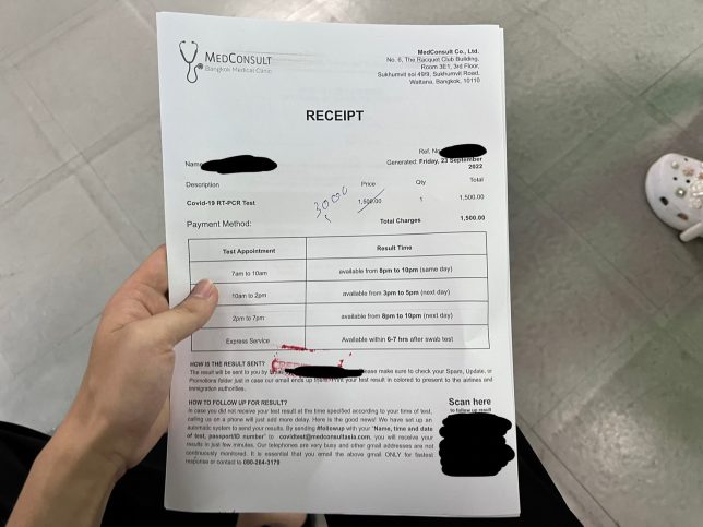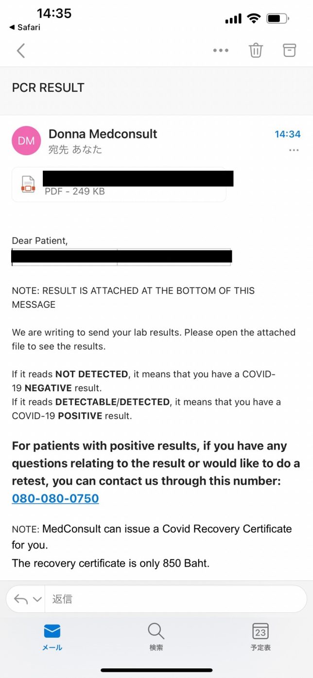 Medconsultは1500バーツ(5730円程度)でPCR検査を受けることができます。