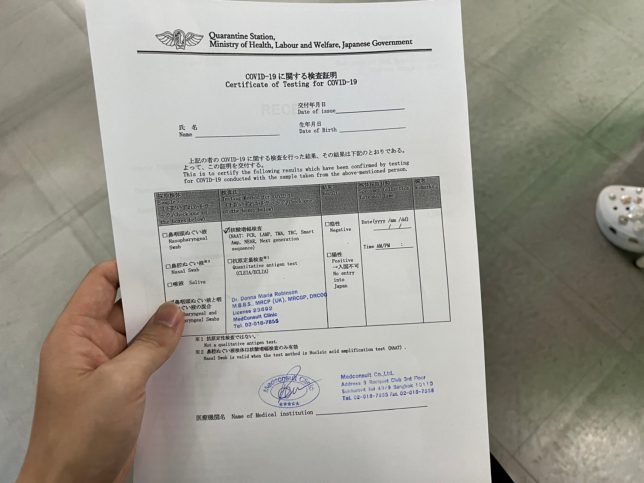 出国時のチェックインカウンターで必要なのはこの検査結果用紙で、帰国するにはこの紙をなんとか用意する必要があります。
