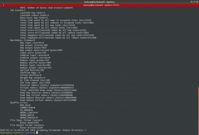 またHadoop streamingは標準入出力を使った処理を行っているので、デバッグ時に入れた標準出力を行う命令はすべてコメントアウトしてください。