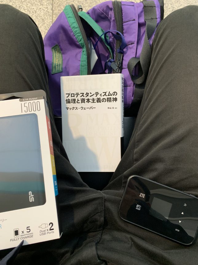 この旅行での暇つぶしコンテンツその1「プロ倫」こと「プロテスタンティズムの倫理と資本主義の精神」、そしてIQが3になった時のためにイヤホンを取り出し、収容棚にバックパックを押し込んだ。