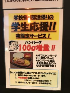 学生証の提示でなんとハンバーグ100g増量!これは学生には刺さりますね!